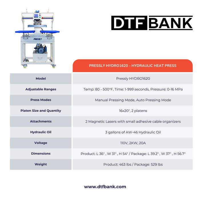 Model: Pressly HYDRO1620 Hydraulic Head Moving Heat Press